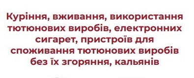- розмістити графічний знак і текст «Куріння, вживання, використання тютюнових виробів, електронних сигарет, пристроїв для споживання тютюнових виробів без їх згоряння, кальянів заборонено!» Макет для друку можна завантажити тут.