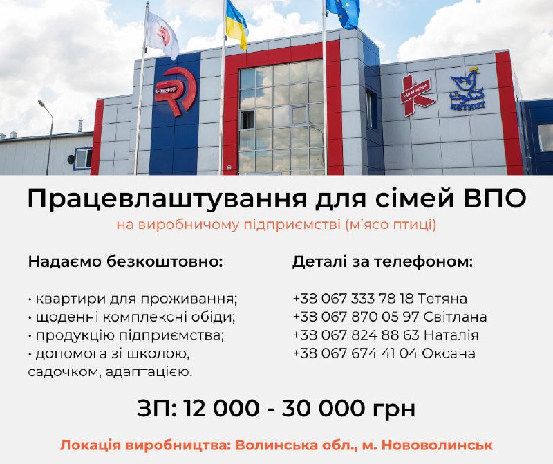 З метою допомоги внутрішньо переміщеним особам у пошуку засобів до існування, забезпеченні житлом та роботою, товариство з обмеженою відповідальністю «ЧІКЕН ТРЕЙД» запрошує працевлаштовуватись на своє підприємство із виробництва курятини, яке розташоване у м. Нововолинськ Волинської обл. Товариство пропонує працевлаштування внутрішньо переміщеним особам та членам сімей, постраждалих від агресії російської федерації, із забезпеченням проживання та харчування, а саме: